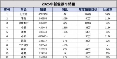 2025新能源车销量收官:“蔚小理”时代终结,零跑小米强势入局