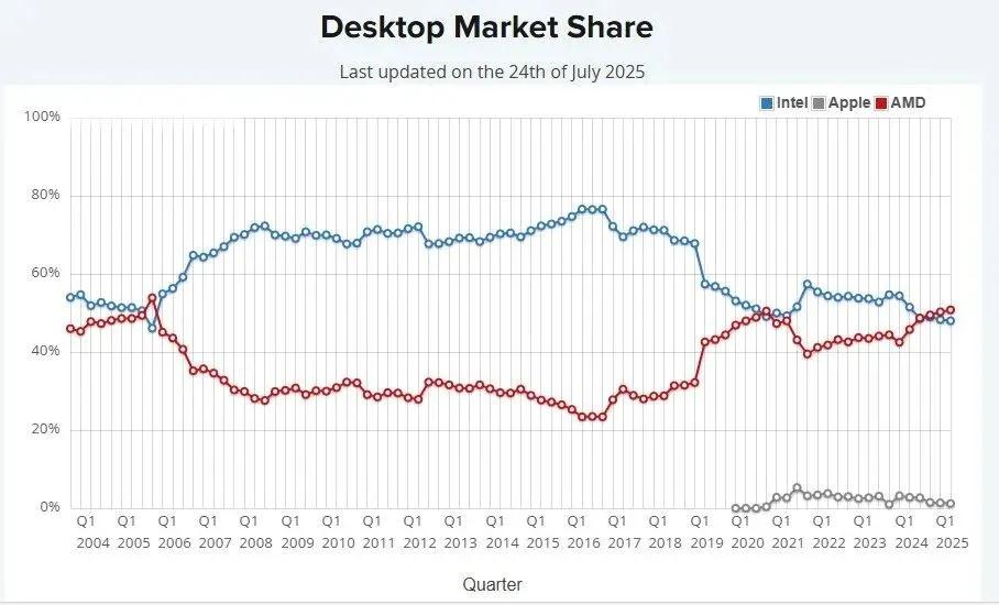 汇总IDC和Mercury Research的调研数据指出,2024年英特尔在服务器处理器市场的份额已降至63%以下,具体为62.7%;同期AMD拥有32.8%的服务器CPU市场份额,且该数据仍处于持续增长态势。预计到2025年底,AMD的市场份额将进一步攀升至36%,致使英特尔份额下降至约55%;展望至2027年,AMD的市场份额可能达到40%,而英特尔预计将跌破50%的关键节点;到2028年,AMD和英特尔的市场份额或呈现旗鼓相当之势。