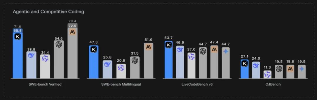 事实上,Kimi K2模型在成本上也很有优势。11月,月之暗面发布了最新的开源巨模型Kimi K2 Thinking,其在推理、编码能力的测试上依然保持领先。