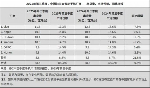IDC最新数据显示,2025年三季度,中国智能手机出货量约6840万台,同比下降0.6%,连续六个季度保持负增长或零增长态势。