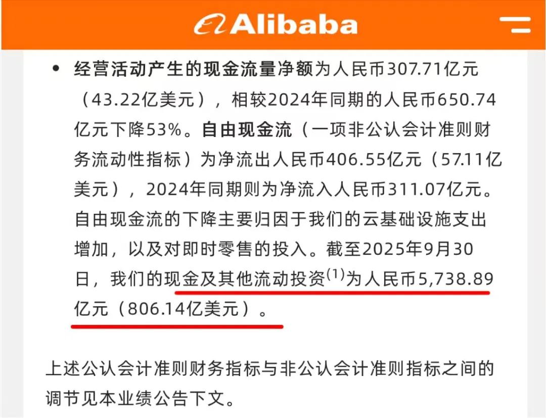 截至2025年9月底,京东现金及短期投资总额为1982.72亿元,阿里巴巴依旧是“现金王”,现金及其他流动投资的总额为5738.89亿元,仍然位列全行业现金流第一。美团的情况要更严重一些,激烈的竞争导致其现金消耗速度较快。