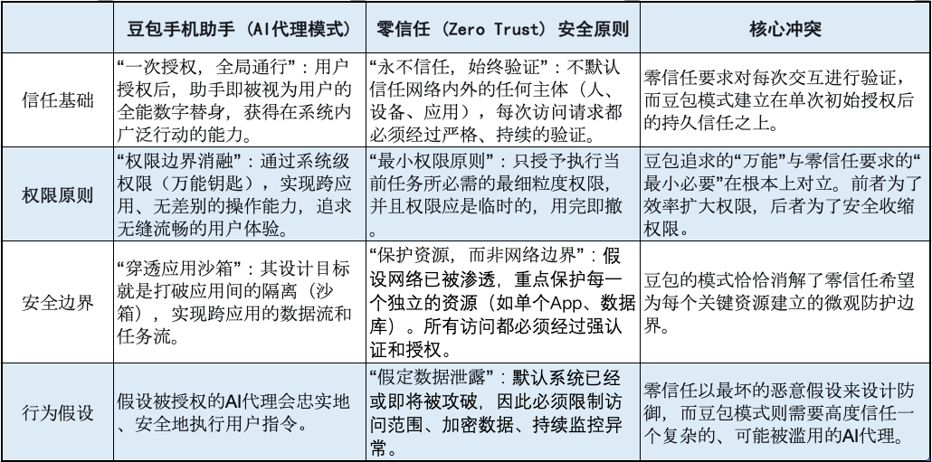这场冲突的实质,是豆包助手所代表的“高度自主的AI代理”模式,与当下已成为信息安全基石的 “零信任”(Zero Trust)原则,在底层逻辑上发生了根本性的碰撞。