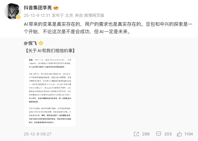 抖音集团副总裁李亮在其微博发文,“距离实现这一切的路已经很近了,但又困难重重。”、“AI带来的变革是真实存在的,用户的需求也是真实存在的。豆包和中兴的探索是一个开始,不论这次是不是会成功,但AI一定是未来。”