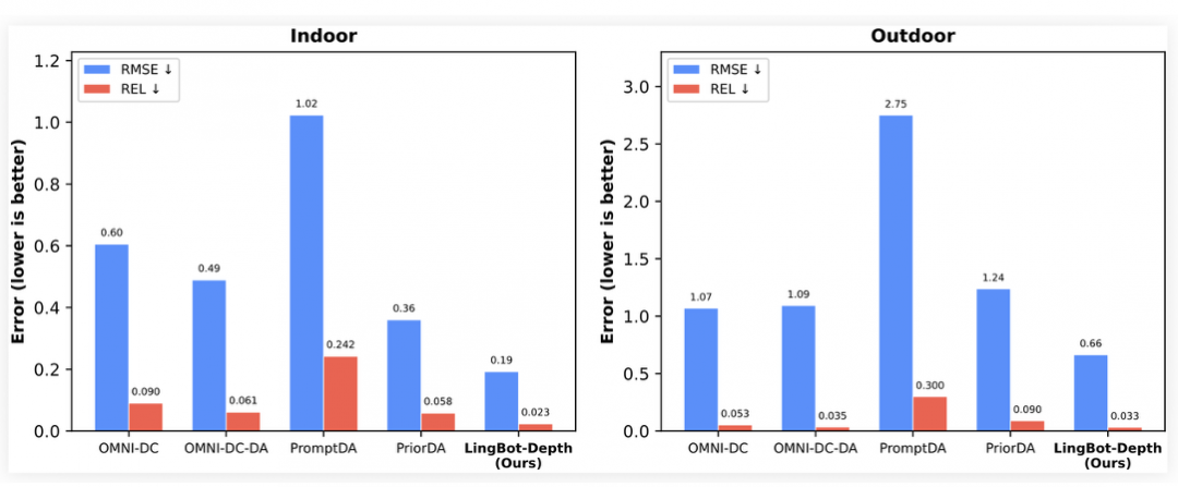 据介绍,在NYUv2、ETH3D等权威基准评测中,LingBot-Depth展现出代际级优势:相比业界主流的 PromptDA与PriorDA,其在室内场景的相对误差(REL)降低超过70%,在挑战性的稀疏SfM 任务中RMSE误差降低约47% 。