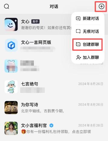 具体使用方法:打开文心APP,点击右上角➕符号,创建群聊。