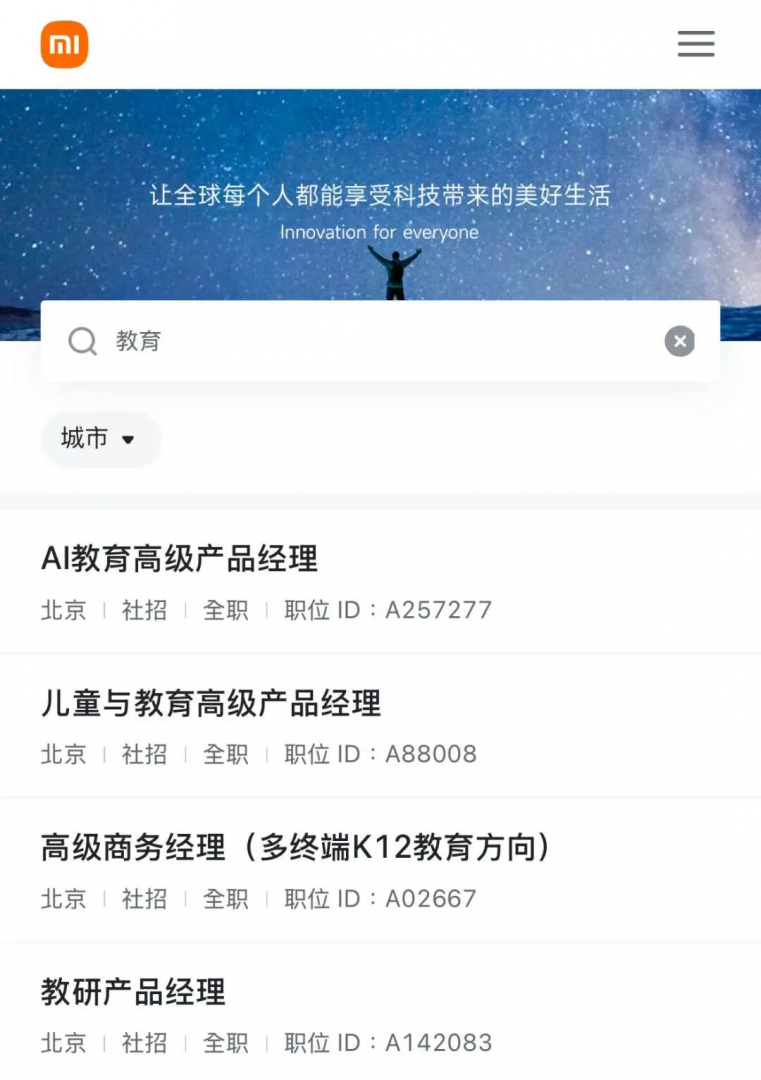 小米放出了“教研产品经理”、“儿童与教育高级产品经理”、“AI教育高级产品经理”、“高级商务经理(多终端K12教育方向)”、“教育平板商务”等多个教育相关业务岗位。