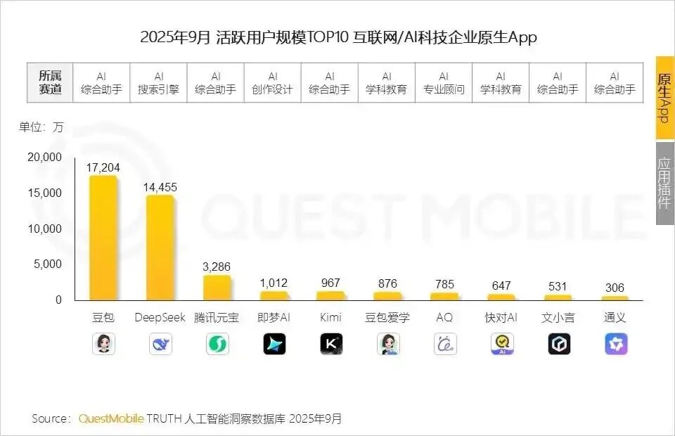 根据QuestMobile公布的2025年三季度AI应用行业报告,字节跳动旗下豆包以1.72亿月活用户登顶榜首,力压Deepseek的1.44亿月活。腾讯元宝虽排在第三,但月活为3286万,与前两者已经不是一个量级。