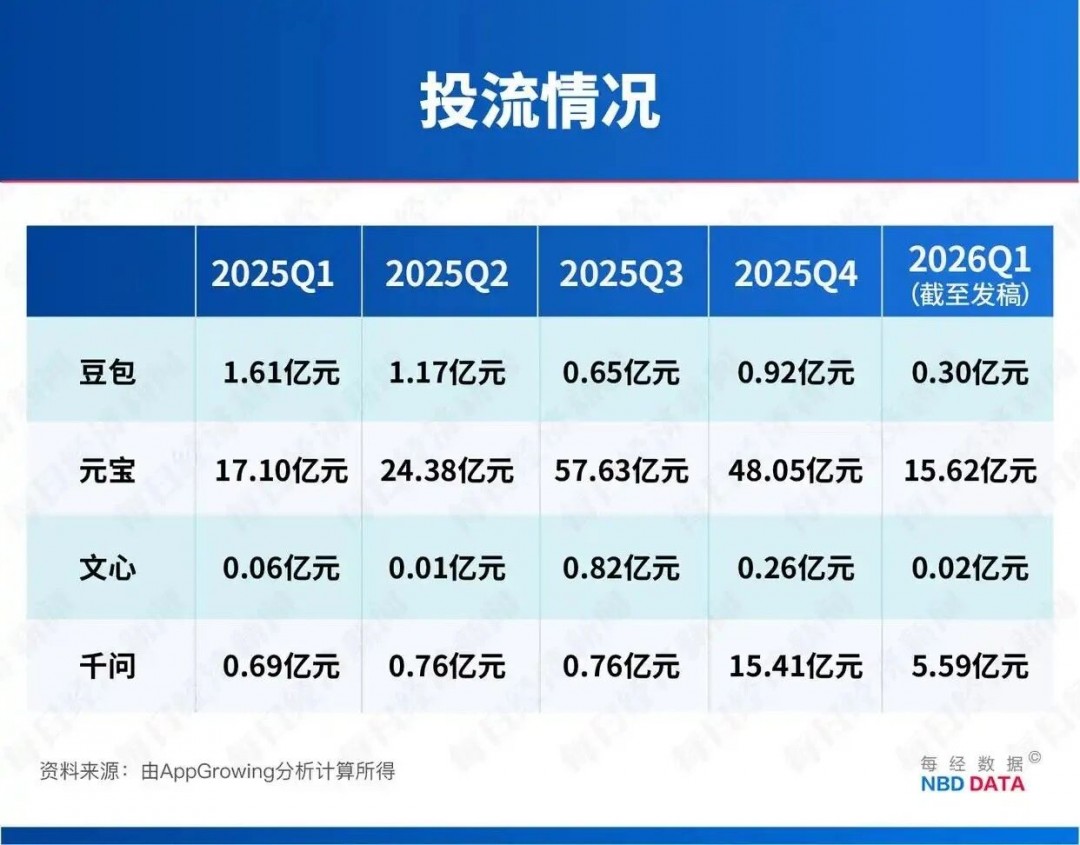 根据AppGrowing估算,元宝在2025年投流高达150亿元。其中,单第三季度投流就高达57.63亿元,而豆包、千问、文心同期投流均不到1亿元。从全年来看,后面三者2025年全年的投流总和(23.12亿元)也赶不上元宝的单季投流。然而,随着绑定DeepSeek所带来的红利期逐渐过去,大力投流所带来的回报比已经开始下滑。