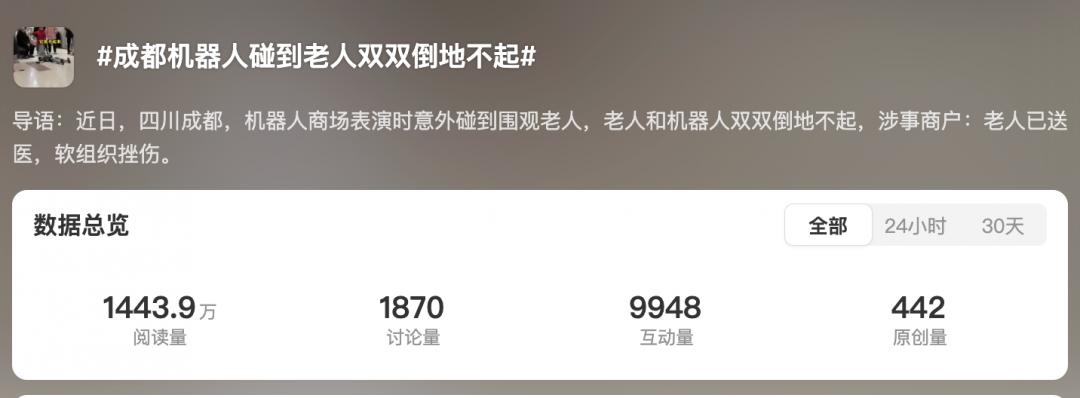截至发稿,“成都机器人碰到老人双双倒地不起”相关话题阅读量已经超过1443万。