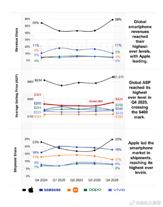 Counterpoint 公布的 2025 年 Q4 全球智能手机市场数据显示,苹果的平均售价达到 1011 美元,大约7019元;而同期 OPPO、三星、vivo、小米的均价,分别在 200 美元出头,甚至更低。