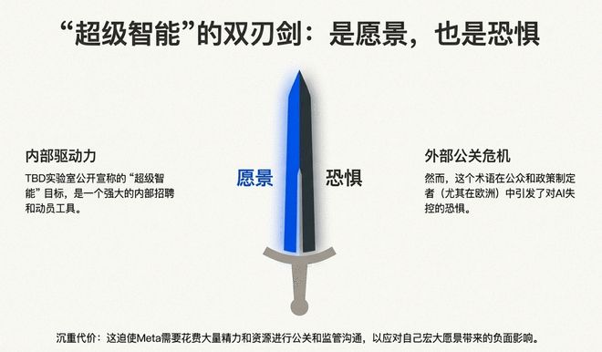 更棘手的是,TBD实验室公开宣称的目标——实现“超级智能”,正成为一把“双刃剑”。市场调研显示,这个术语在政策制定者和公众中引发了对AI不受控制的恐惧,特别是在欧洲。一些科技名流甚至呼吁禁止开发这类系统。这迫使Meta需要花费大量精力在公关和监管沟通上,以期将“超级智能”的愿景推销给用户、监管机构和投资者。