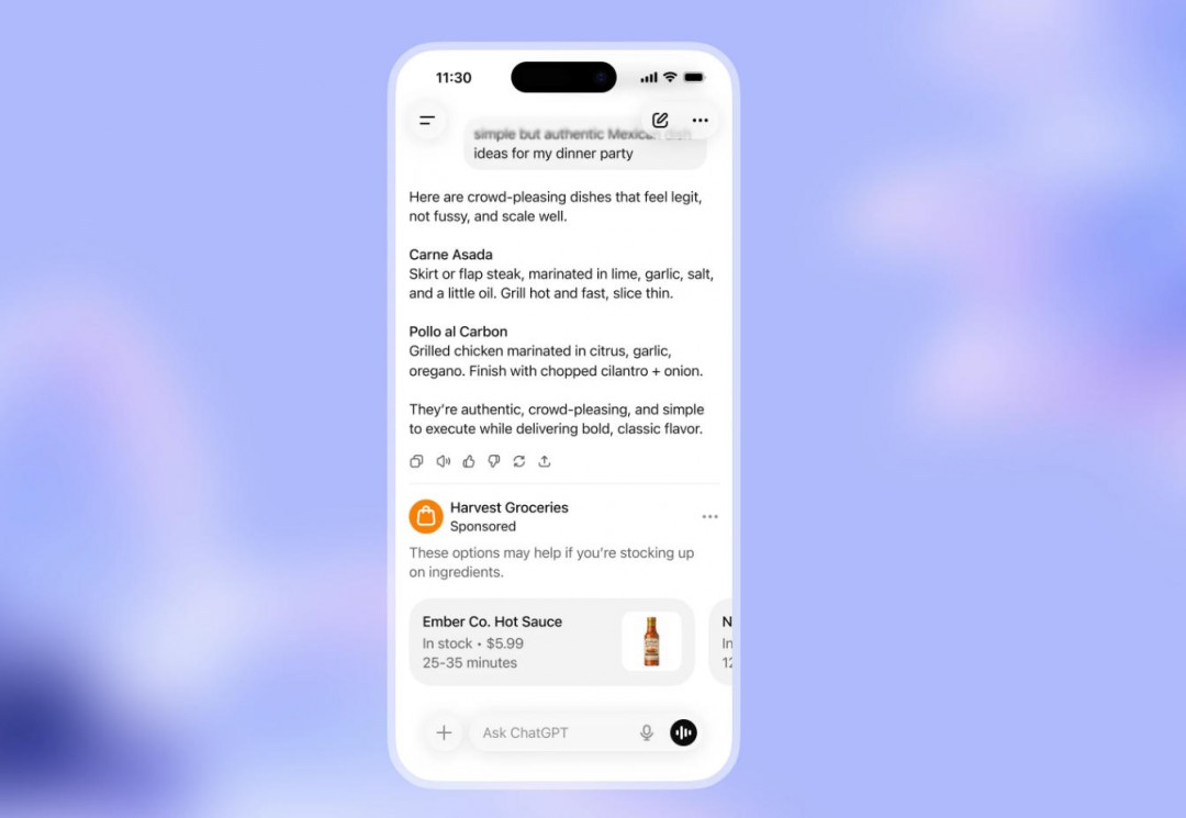 OpenAI 会根据以下因素匹配广告:当前对话的主题;用户的历史聊天记录;过往与广告的互动情况。示例:当用户搜索食谱时,可能会看到生鲜配送服务或餐食套件的相关广告。