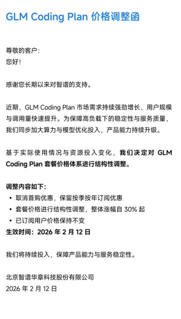 同时,智谱宣布GLM Coding Plan套餐价格调整。调整内容如下:取消首购优惠,保留按季按年订阅优惠;套餐价格进行结构性调整,整体涨幅自30%起;已订阅用户价格保持不变。生效时间:2026年2月12日。