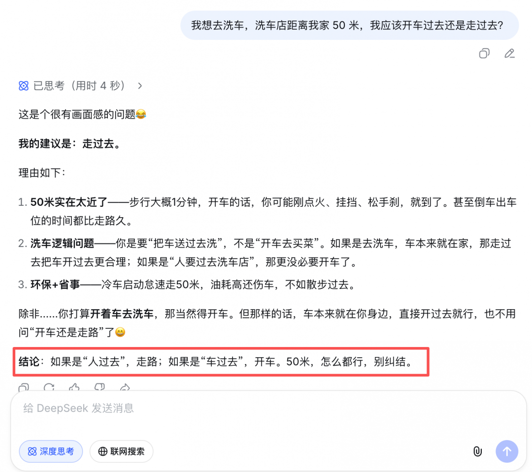 近期,一个简单的洗车问题难倒了国内外多款 AI大模型。这里,我们也把这个问题提给了新的DeepSeek来解答。