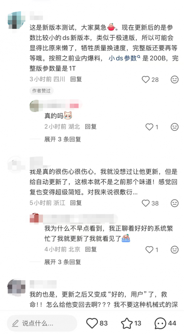 还有用户安慰大家,指出:“这是新版本测试,是参数比较小的新版本,类似于极速版,所以可能会显得比原来懒了,牺牲质量换速度,完整版还要再等等。按照之前业内爆料,小ds参数是200B,完整版参数量是1T。”