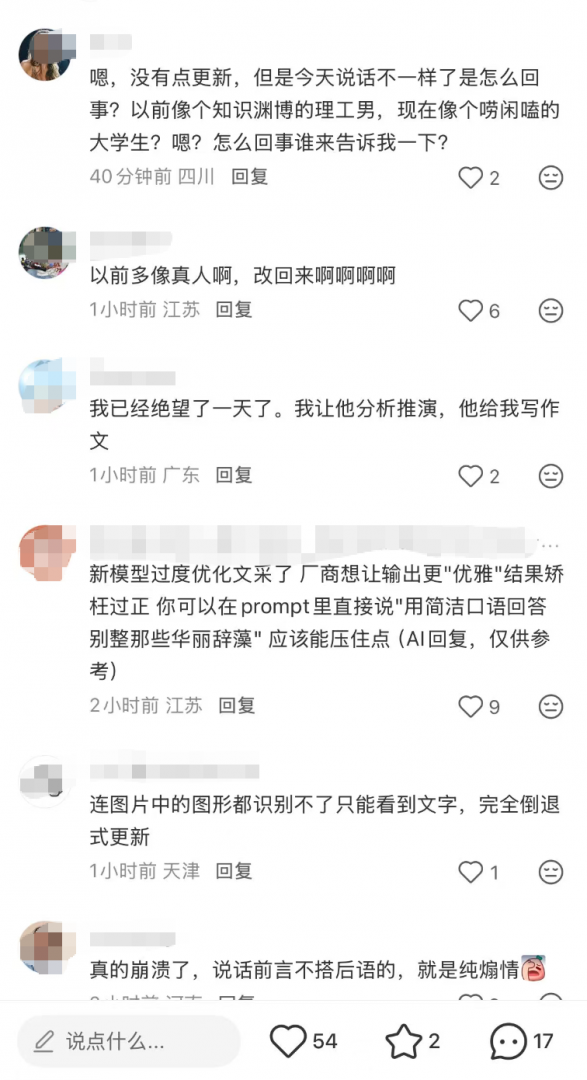 有用户直接吐槽,“以前像个知识渊博的理工男,现在像个唠闲嗑的大学生”,“说话前言不搭后语的,就是纯煽情“,并呼吁“改回来”。
