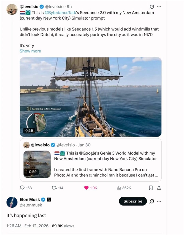 在海外市场,尽管尚未正式开放,Seedance 2.0却引发了现象级的追捧。由于注册门槛,海外社交平台涌现大量“引渡教程”,甚至衍生出倒卖成品账号、代充积分的灰色产业链,有从业者两天内获利超8000美元。好莱坞导演Charles Curran仅用20分钟、花费60美元便制作出高质量的《光环》真人预告片,他震撼地表示该工具“或将颠覆整个好莱坞”。马斯克也转发相关内容,感叹AI发展速度之快。