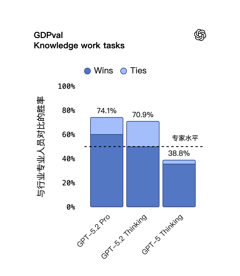 在该评测中,GPT‑5.2 Thinking 是首个达到或超过人类专家水平的模型。