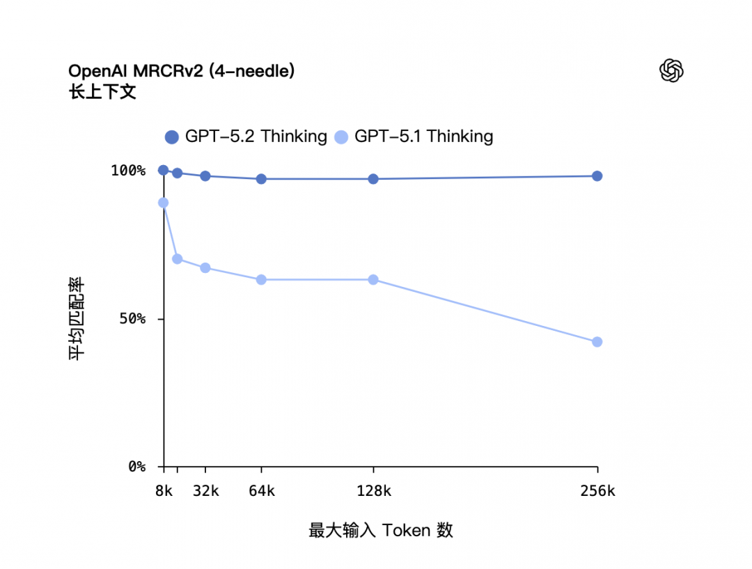 GPT‑5.2 Thinking 在长上下文推理方面树立了新的技术标杆。OpenAI MRCRv2 是一项用于测试模型整合长文档中分散信息能力的评估,GPT‑5.2 Thinking 在该评估中表现领先。在深度文档分析,如需要跨数十万 Token 关联信息,GPT‑5.2 Thinking 的准确性显著高于 GPT‑5.1 Thinking。在 4-needle MRCR 评测变体(最长可达 256k Token)中实现接近 100% 的准确率。
