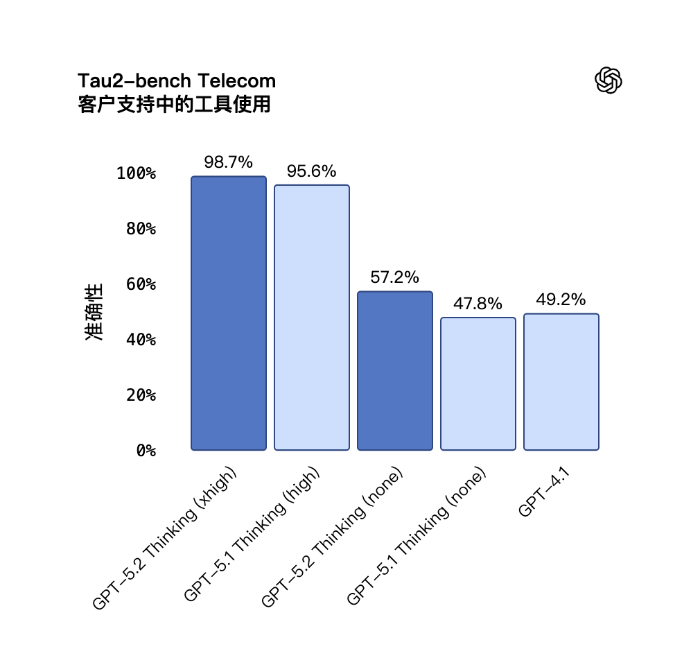 GPT‑5.2 Thinking 在 Tau2 bench Telecom 测试中取得了 98.7% 的全新优异成绩,展示了它在长程、多轮任务中可靠使用工具的能力。
