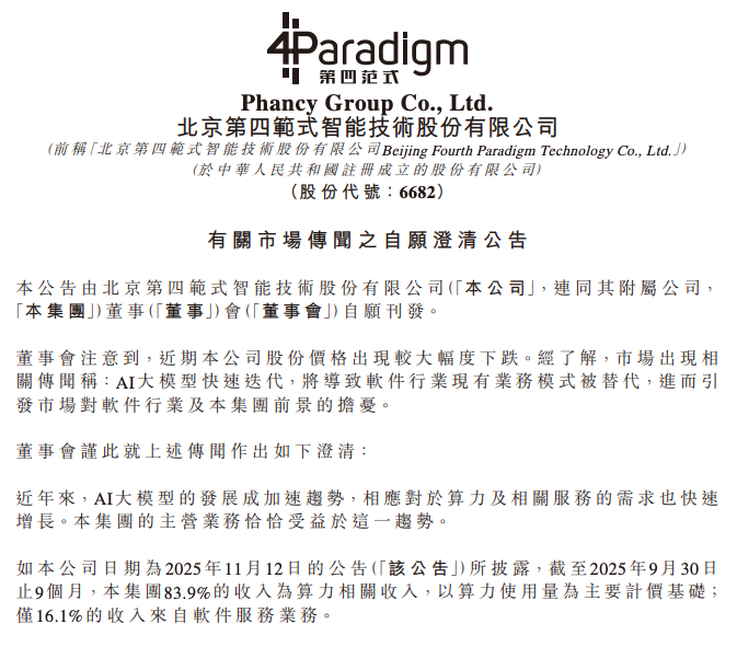 2月25日消息,北京第四范式智能技术股份有限公司(股份代号:6682)在今日股市开盘前发布自愿性澄清公告,回应近期市场传闻及股价下跌。