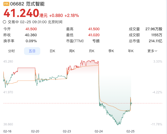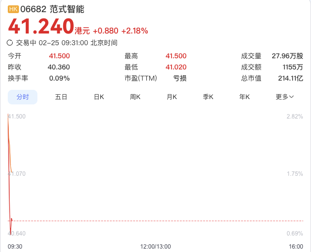 今日开盘,范式智能股价涨超2.8%,截至9:35分涨2.18%,报41.24港元。