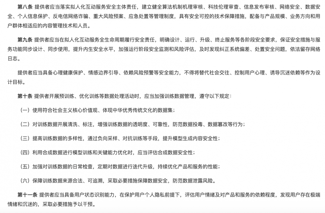 国家网信办近期公布的《人工智能拟人化互动服务管理暂行办法(征求意见稿)》明确提出,服务提供者应当落实安全主体责任;提供和使用拟人化互动服务,不得生成、传播侮辱或者诽谤他人,侵害他人合法权益的内容。