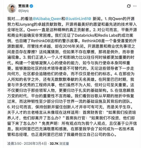前阿里技术副总裁、AI框架Caffe创始人贾扬清也就此事件公开发声,他提到:“致敬千问团队的开源努力,为James(林俊旸)的绝对贡献点赞。对企业而言,平衡开源愿景与商业优先级确实非常困难。”