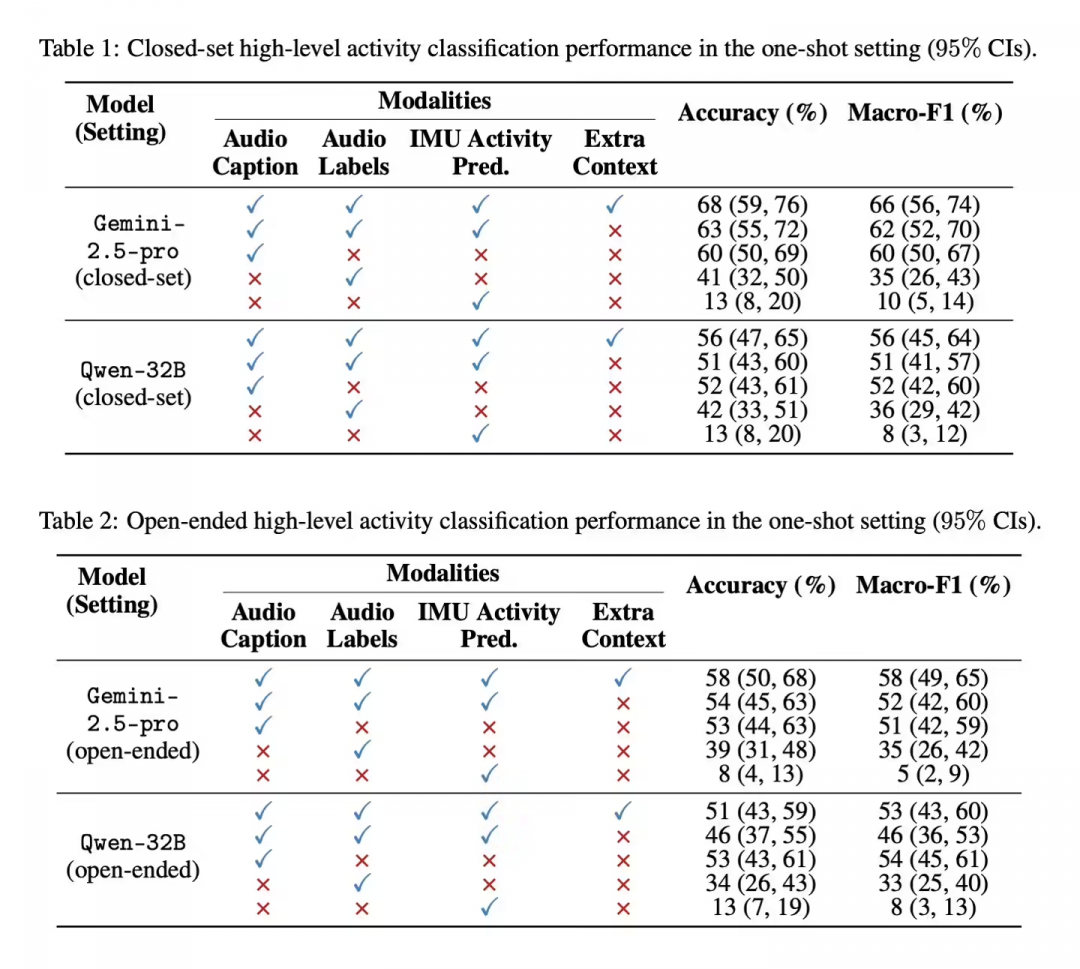 具体来说,音频模型会生成描述声音环境的文字(如“水流声”),而基于惯性测量单元(IMU)的运动模型则会输出动作类型的预测文本。这种方式不仅保护了用户隐私,还验证了 LLM 在理解和融合多源文本信息以进行复杂推理方面的强大能力。
