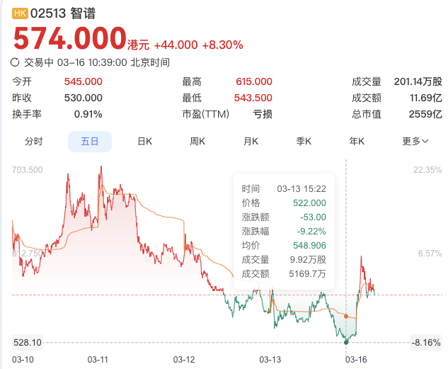 今日港股开盘,智谱公司股价大涨15%,截至10:39分,股价涨8.3%。在此之前,智谱公司股价已连跌多日,最大跌幅一度超50%。