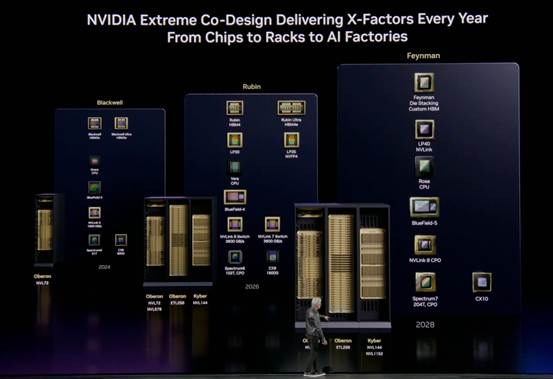 黄仁勋预告了下一代架构——Feynman架构GPU。它将采用3D堆叠芯片和定制化的HBM(高带宽内存)技术,标志着英伟达已经将研发目光投向了2030年。。