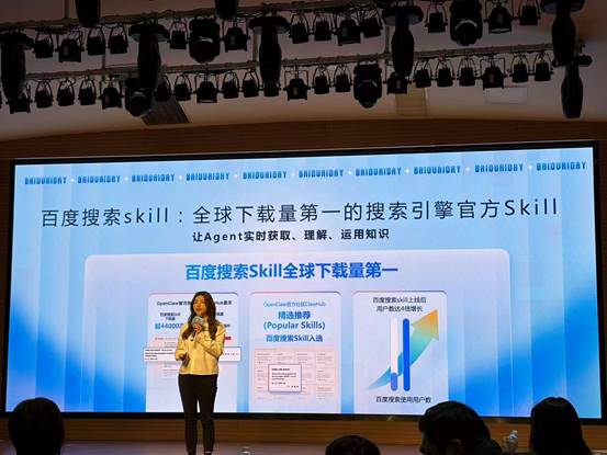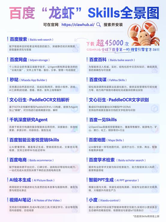 百度还宣布上新多款Skills,其中百度搜索Skill下载量超4.5万次,是全球下载量最大的搜索引擎官方Skill,成为“龙虾必备”。
