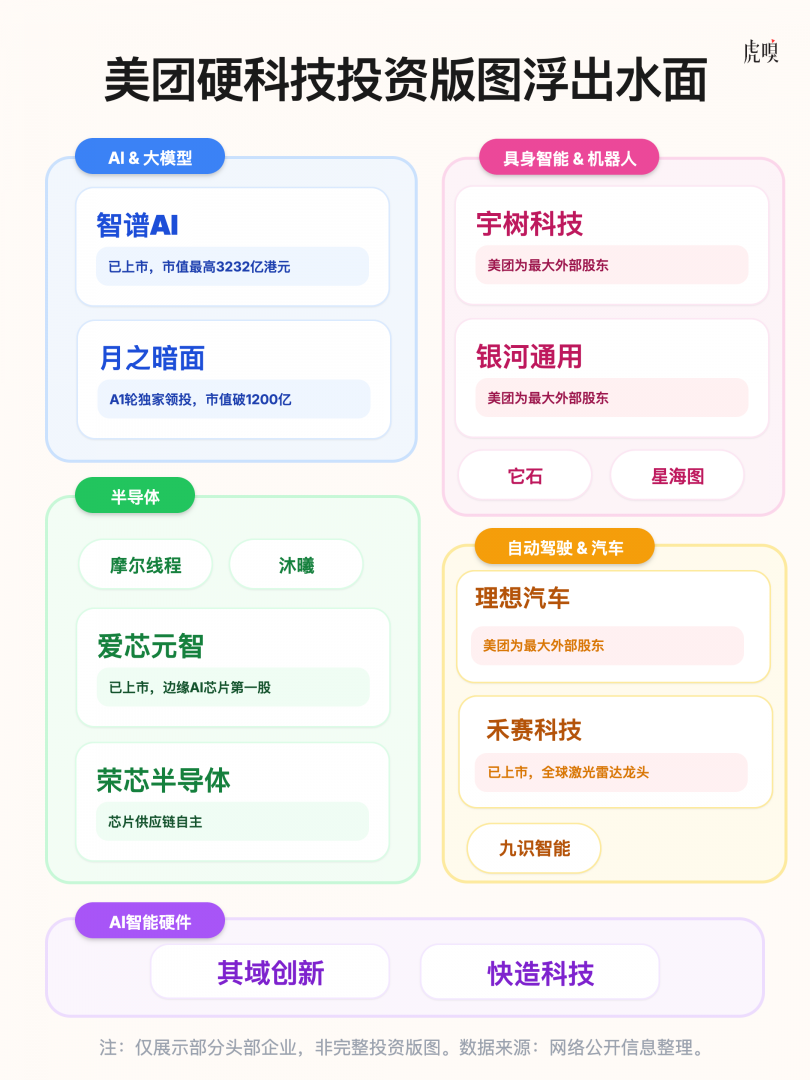 过去五年,美团投资的硬科技公司至少有43家,其中包括28个科技独角兽,涵盖半导体、AI大模型、具身智能与机器人、自动驾驶和智能硬件五大核心赛道,几乎覆盖了AI全产业链。