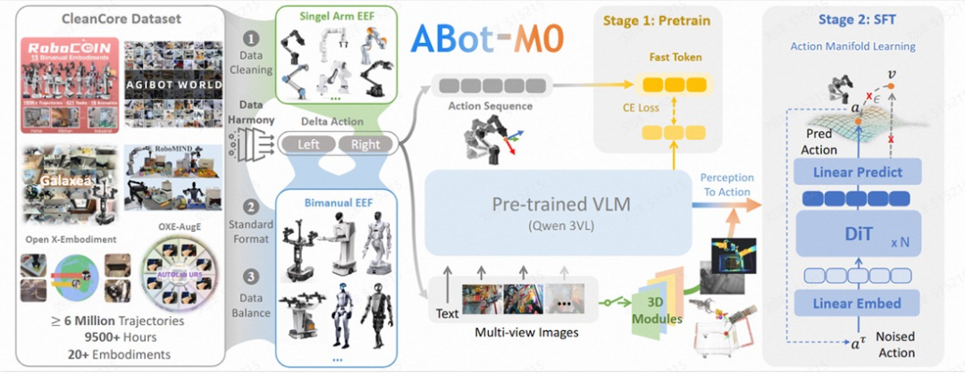 数据层面,ABot-M0开源了目前规模最大的通用机器人数据集UniACT,整合超过600万条真实操作轨迹,并提供从原始异构数据到标准化训练数据的全流程处理管线。