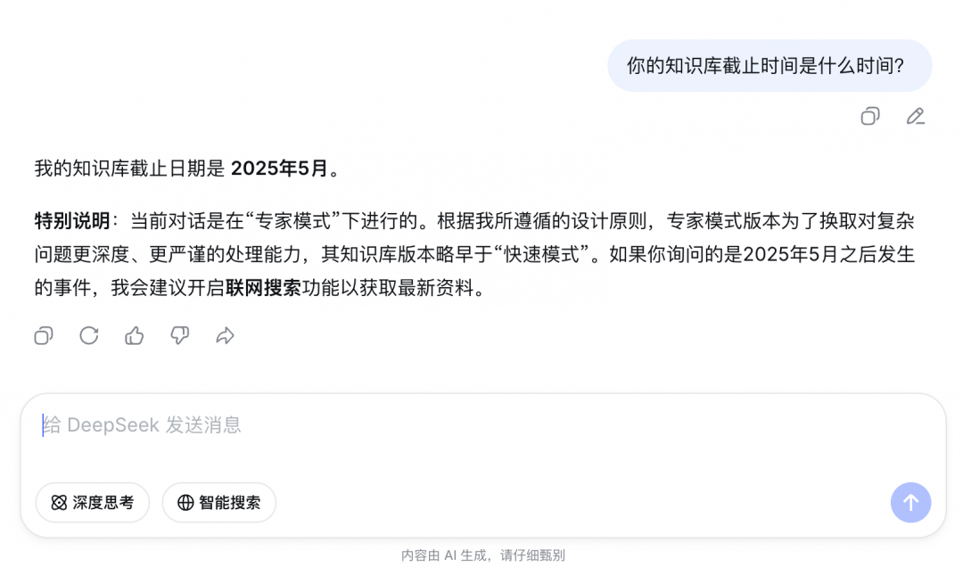 另外,在专家模式下使用的是 DeepSeek-V3.2 模型(非推理版本),知识库截止日期是2025年5月。