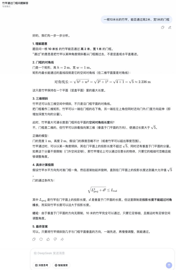 我们设计了一道经典的数理问题:“一根10米长的竹竿,能否通过高2米、宽1米的门框?”