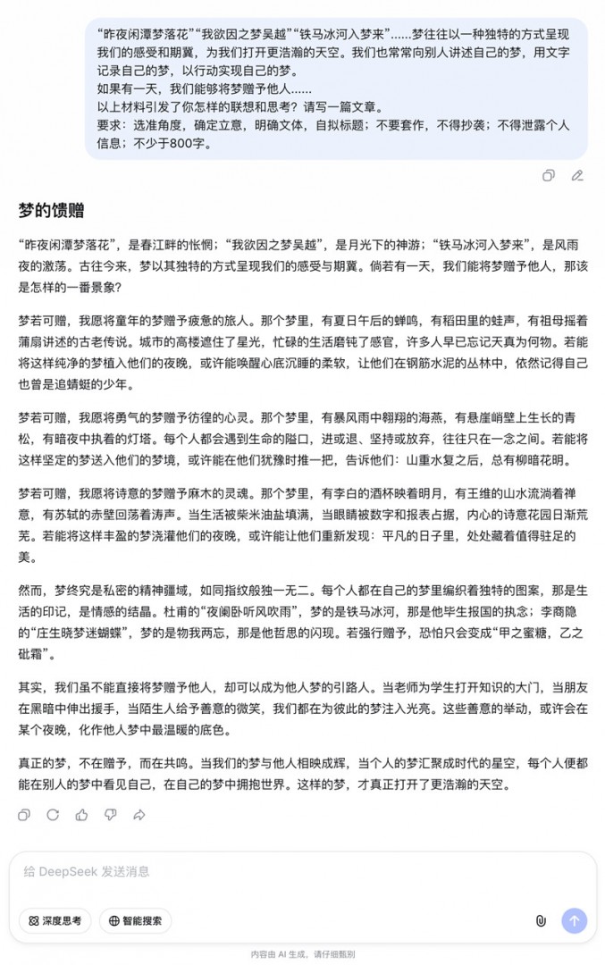 快速模式:背后运行的模型参数量较小(或量化程度更高),且系统在收到问题后,会自动在问题前插入一段长长的隐藏提示词。这段提示词强制要求DeepSeek “用最通俗的大白话回答”“尽量分点”“先总结再展开”。这让回答结构固定、出字飞快,但会稍微限制DeepSeek深挖的欲望。