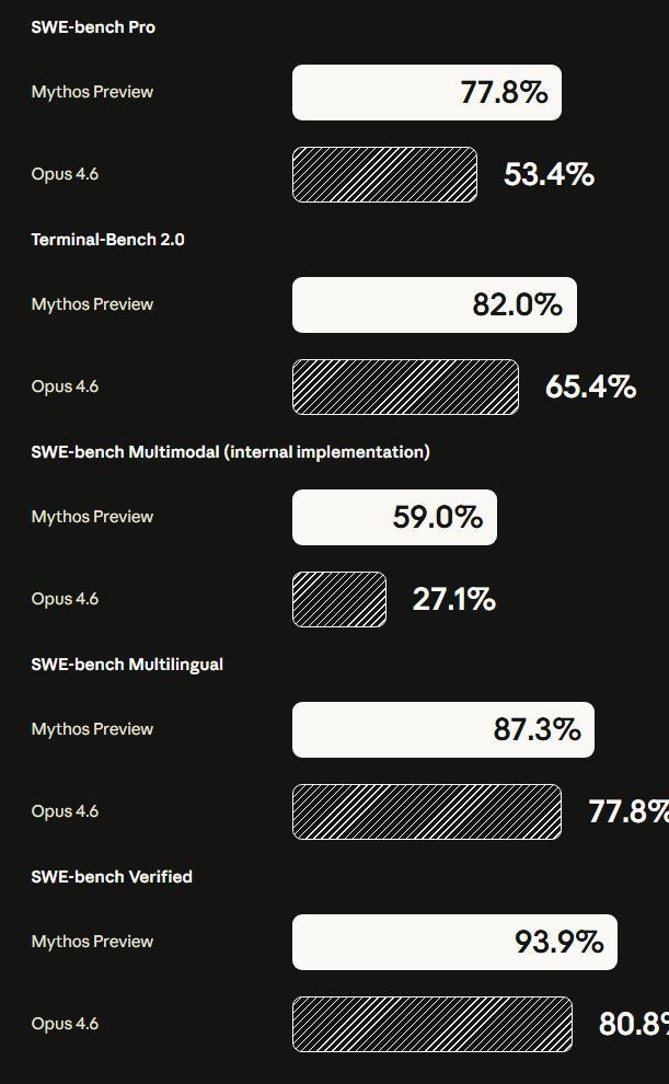 Mythos在没有任何专门网络安全训练的前提下,仅仅靠代码能力的自然进化,就实现了对上一代最强模型Claude Opus 4.6的全面超越。