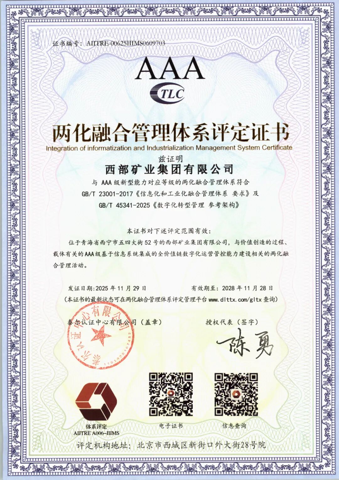 两化融合管理体系由工业和信息化部主导制定,是我国首个覆盖信息化和工业化融合全局、全要素、全过程的管理体系标准,代表公司已实现信息化与工业化的深度融合。此次两化融合管理AAA级评定不仅以国家高标准验证了公司数字化转型与“两化”融合的扎实成效,更彰显了公司在传统矿业领域的转型标杆地位,为全行业数字化转型与“两化”深度融合树立了可复制、可借鉴的典范。