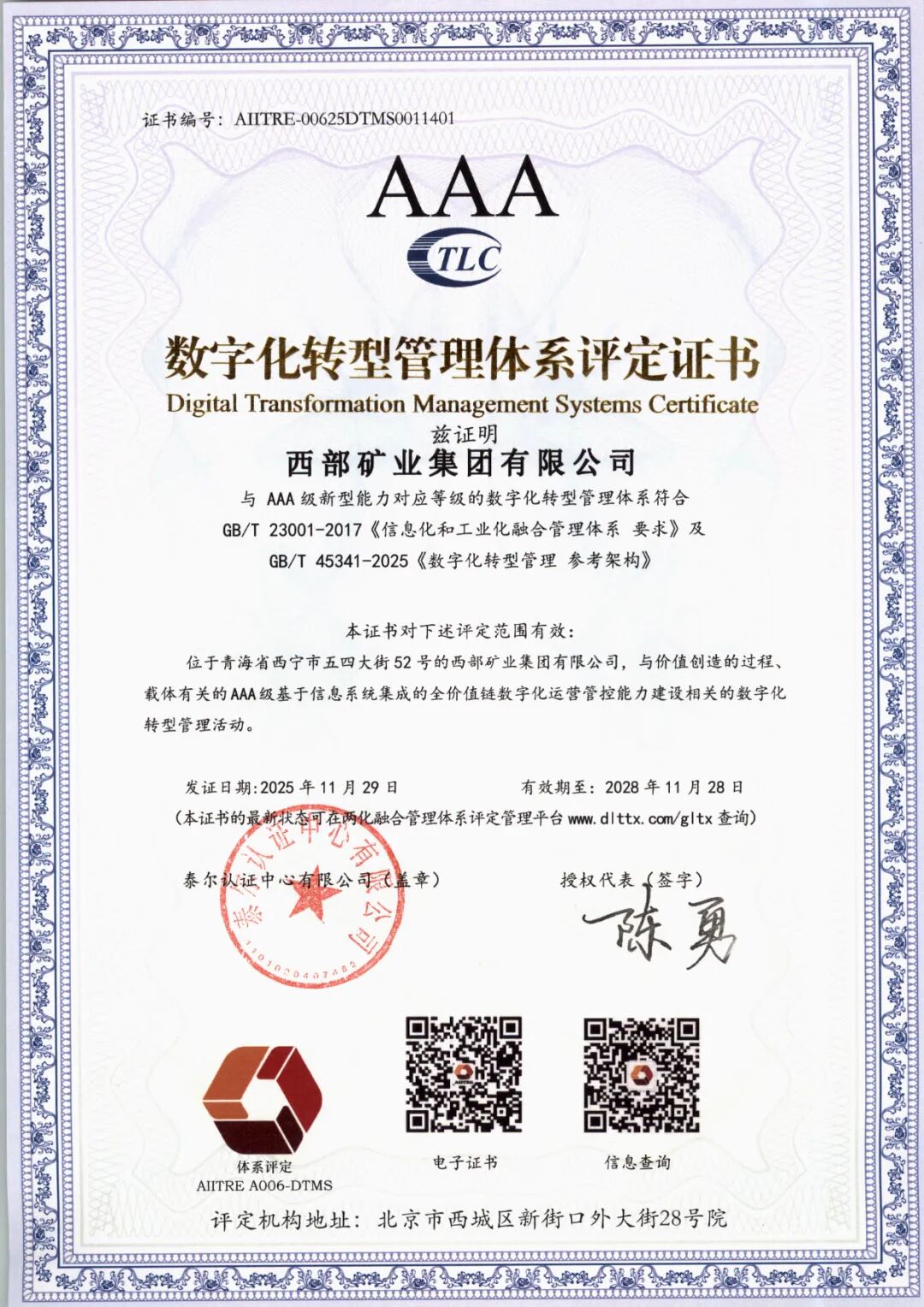 数字经济管理中心讯近日,西部矿业(601168)集团有限公司通过工业和信息化部《信息化和工业化融合管理体系要求》(GB/T23001-2017)及《数字化转型管理参考架构》(GB/T45341-2025)体系认证,获得两化融合管理体系AAA级认证和数字化转型管理体系AAA级认证。