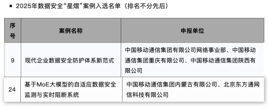 近日,以“AI聚力,智启新篇,安全同行”为主题的“数据安全共同体计划成员大会(2025)”在京成功召开。大会正式公布2025年数据安全“星熠”优秀案例入选名单,不仅展示我国在数据安全领域的最新成就,也为各行业提供了宝贵的经验参考和实践指南。由东方通支撑的现代企业数据安全防护体系新范式案例,以及东方通携手中国移动(600941)通信集团内蒙古有限公司打造的基于MoE大模型的自适应数据安全监测与实时阻断系统案例,均成功入选优秀案例名单。