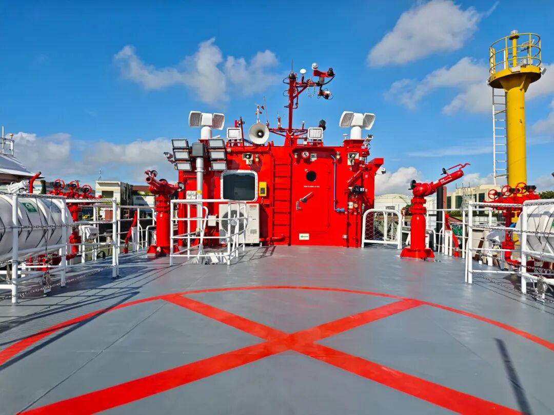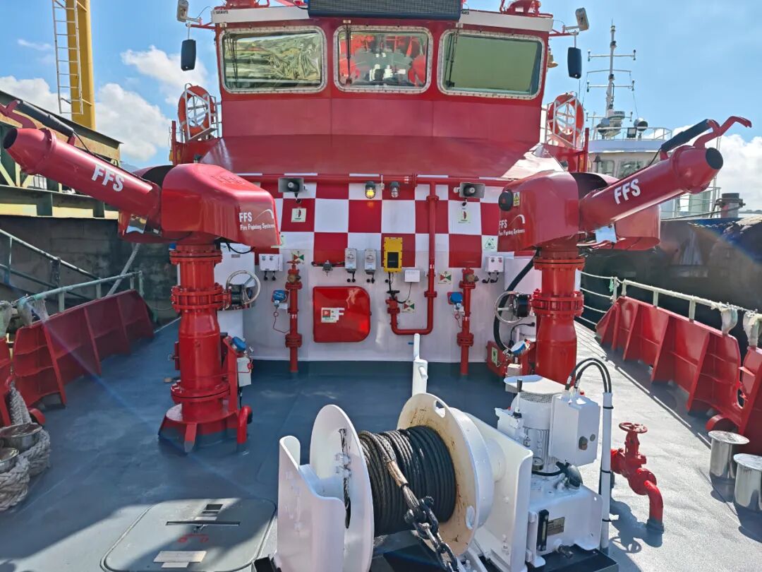 作为“移动消防堡垒”,其4门遥控消防炮构建无死角防线:首部两门水流量1200m/h、泡沫流量600m/h,射程达150米;尾部两门以600m/h水流量和300m/h泡沫流量形成补充,射程130米。