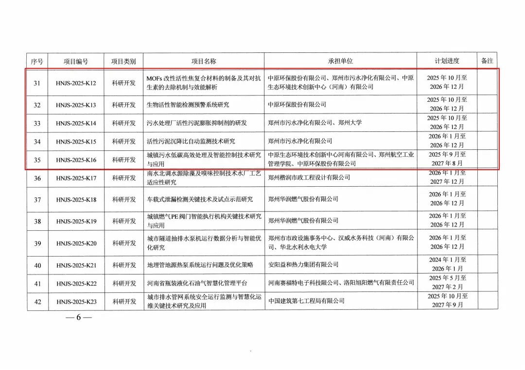 此次获批的“农业废弃物协同市政污泥热解气化技术研究”“MOFs改性活性焦复合材料的制备及其对抗生素的去除机制与效能解析”“生物活性智能检测预警系统研究”“污水处理厂活性污泥膨胀抑制剂的研发”“活性污泥沉降比自动监测技术研究”“城镇污水低碳高效处理及智能控制技术研究与应用”6项课题分别由中原环保及下属净化公司、创新中心牵头承担,内容涵盖了污泥处理技术、新型材料研发、智能检测预警、污水处理技术等多个方面。