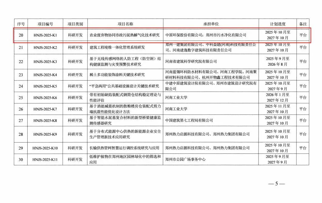 近日,河南省住房和城乡建设厅发布《关于印发2025年河南省住房和城乡建设科技计划项目的通知》,中原环保(000544)股份有限公司申报的“农业废弃物协同市政污泥热解气化技术研究”等6项课题成功入选科技开发项目。