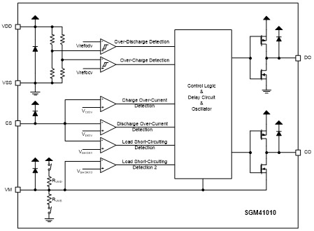 SGM41010系列电池保护芯片专为锂离子和聚合物充电电池设计,集成了高精度的电压检测和延时功能。这款芯片的主要任务是保护单个锂离子或聚合物电池,防止它们遭受过充、过放和过流的损害。它内置的高精度电压检测电路包括: