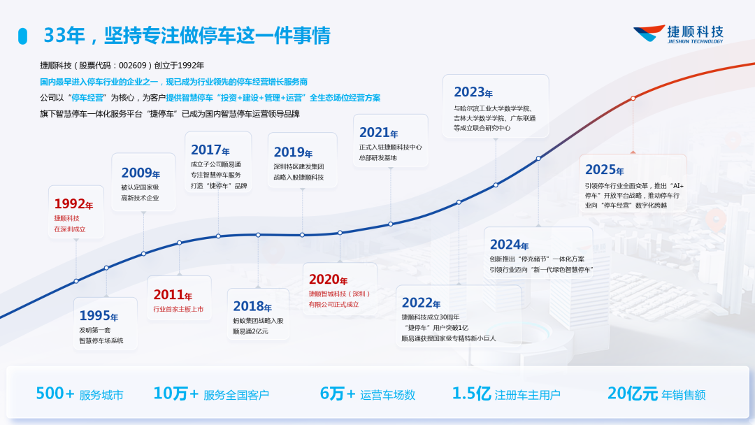 “捷顺的第一个特点是活得比较长。”凌广文开宗明义。成立于1992年的捷顺,已走过33年,其长青得益于三大特质:专注、积累与拥抱变化。33年来,捷顺始终专注于停车领域,连接了6万多个车场、3000万个泊位,拥有1.5亿用户,覆盖了私家车核心群体。