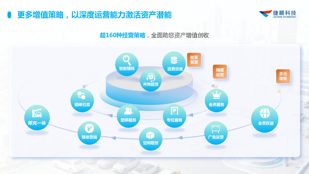 通过对不同区域、不同时段停车需求的深入分析,捷顺开发出近160种经营策略,并创新性地推出“存量保底+增量分成”0风险增收模式,通过数字化经营,与客户共创价值,共享收益。