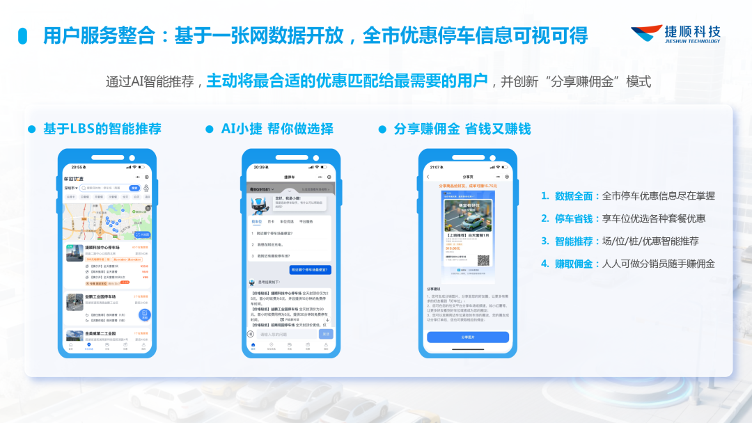 长期以来,智慧停车行业多聚焦于B端客户的需求满足,相对忽视了最终用户的服务体验。平台的价值不应仅是余位信息,更应转化为用户的优惠与便捷,平台一定是基于用户优惠信息而产生活跃。捷顺正推进基于地理位置的服务优化,并引入互联网分销思维,鼓励用户分享,形成良性运营循环。