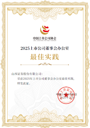 本年度,山西证券凭借在治理与证券事务工作中的良好表现,同时获评中国上市公司协会“2025年上市公司董事会秘书履职评价5A评级”“2025年上市公司可持续发展优秀实践案例”“2025年中国上市公司内部控制优秀实践案例”“2025年上市公司董事会办公室最佳实践”等奖项。