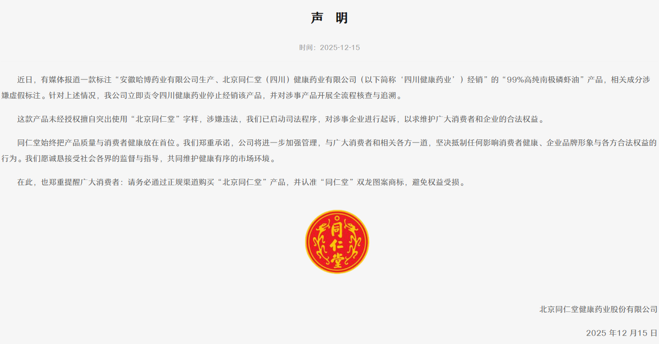12月15日,同仁堂健康针对此次争议事件正式发布声明。声明中提到,近日有媒体报道一款标注“安徽哈博药业有限公司生产、四川健康药业经销”的“99%高纯南极磷虾油”产品,相关成分涉嫌虚假标注。针对上述情况,公司立即责令四川健康药业停止经销该产品,并对涉事产品开展全流程核查与追溯。这款产品未经授权擅自突出使用“北京同仁堂”字样,涉嫌违法,公司已启动司法程序,对涉事企业进行起诉。同时,该公司在声明中也提醒广大消费者,务必通过正规渠道购买“北京同仁堂”产品,并认准“同仁堂”双龙图案商标,避免权益受损。